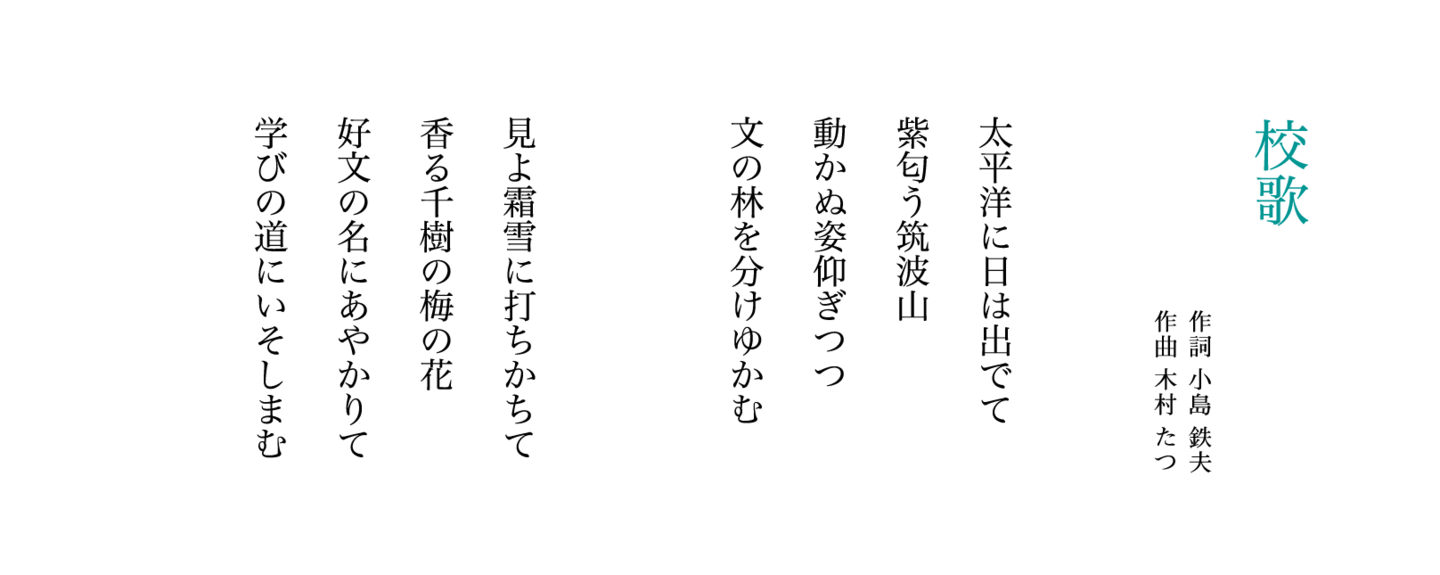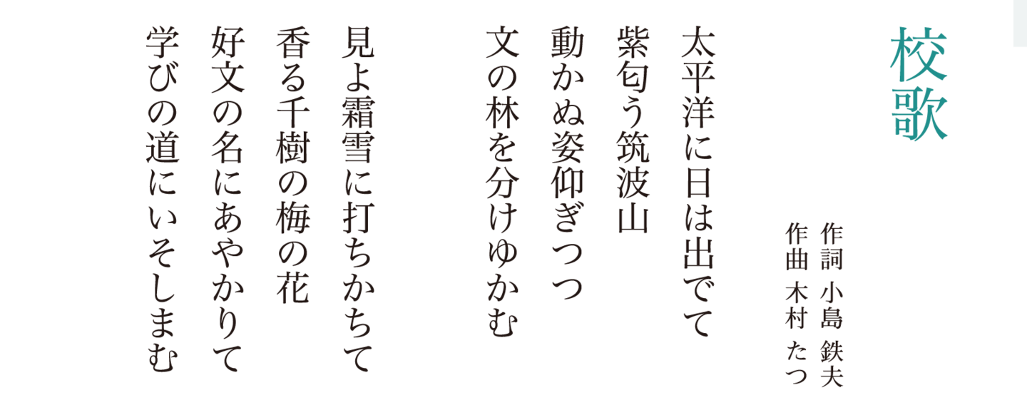 常磐大学高等学校の校歌は、1941年に当時の国語科の小島鉄夫教諭が作詞を、音楽科の木村たつ教諭が作曲を担当されました。その後、1951年に歌詞の変更があり、2000年の男女共学化に合わせて、4番まであった歌詞を2番までに変更しました。時代の移り変わりとともに歌詞の変更はありましたが、メロディは一貫して同じものを歌い継いでいる、伝統のある校歌です。