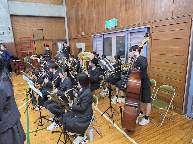 新しい副顧問である飛田先生の指揮のもと、新入生の入場でマーチ、スーザ作曲《美中の美》および《星条旗よ永遠なれ》と校歌の演奏を行いました。マーチを演奏し続けるのは体力勝負でしたが、新学期の新たな気持ちと新入生への期待感に包まれ、部員一同、最後まで楽しく演奏することができました。会場も温かい雰囲気に包まれ、新入生の皆さんにとって思い出に残る時間となっていれば嬉しいです。