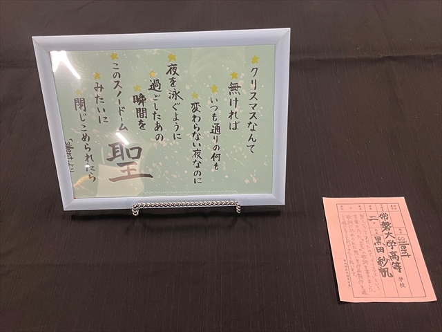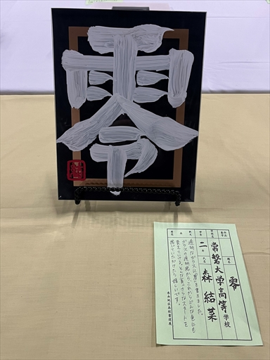 | 近況(実績) | 四国大学主催 全国高校書道展 推薦・準特選など 日本武道館主催 書写書道大展覧会 日本武道館賞・大会奨励賞・特選など 全国書画展覧会運営委員会主催 ふれあい書道展 特選・奨励賞など 古河篆刻美術館主催 高校生篆刻展 出品 水戸市消防局「秋季火災予防運動」ポスター揮毫(予定) 茨城県高等学校総合文化祭美術展覧会書道の部 入選 |