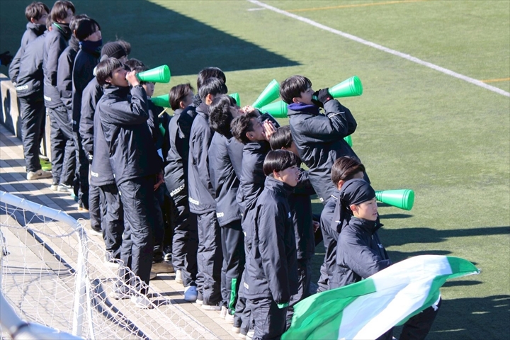 1回戦はシードのため、本校は初戦でした。試合序盤からボールを保持し、相手陣地へ押し込む展開が続きました。得意のセットプレーからの先制点をきっかけに、前半だけで3得点を奪うことができました。後半に入っても、サイド攻撃を中心にチャンスの場面を作り続け、大量得点で試合終了となりました。