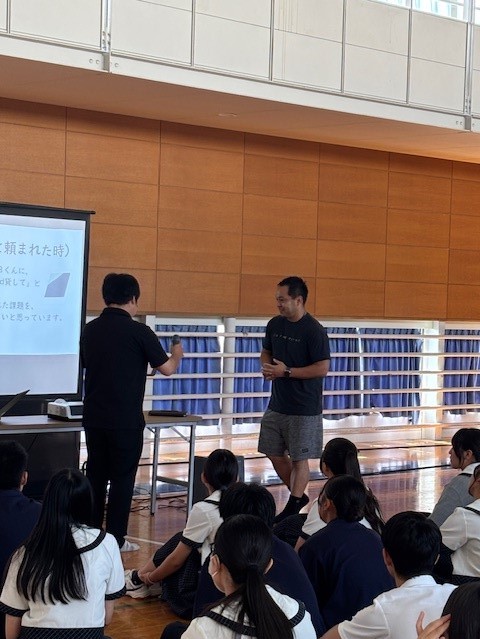 第2学年を対象に、本校のスクールカウンセラーである、櫻井先生と伊坂先生による、アサーション・トレーニングを実施しました。今回はロールプレイやペアーワークを通して、「言いたいことが言えない」「つい強く言いすぎてしまう」など、日常でありがちな場面を体験的に学びました。また、担任の先生方にも、「悪い見本」「良い見本」のやりとりを実演していただきました。先生方の少しユーモラスなやりとりに、生徒たちは笑顔を見せながらも、伝え方ひとつで印象が大きく変わることを実感していました。