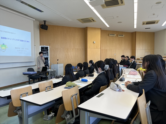 講義形式の体験授業では、「看護職のキャリアと大学で看護を学ぶ意味」というテーマに基づき、看護といっても多くの職種、資格、働き方があることを学びました。この授業は将来の進路選択に向けて非常に役立つ学びとなりました。