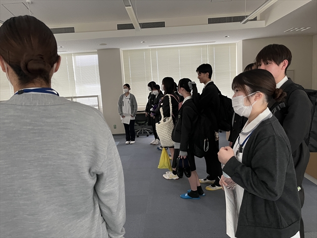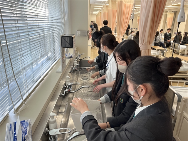 その後、「看護師が行う衛生的手洗い」の体験授業会場に移動しました。現役学生の方々にキャンパスを案内していただきながら、道中では4年生が国家試験に向けた勉強会に取り組む様子を見る機会もありました。現役学生の真剣な姿に触れ、大学生活のリアルな一面を感じることができました。