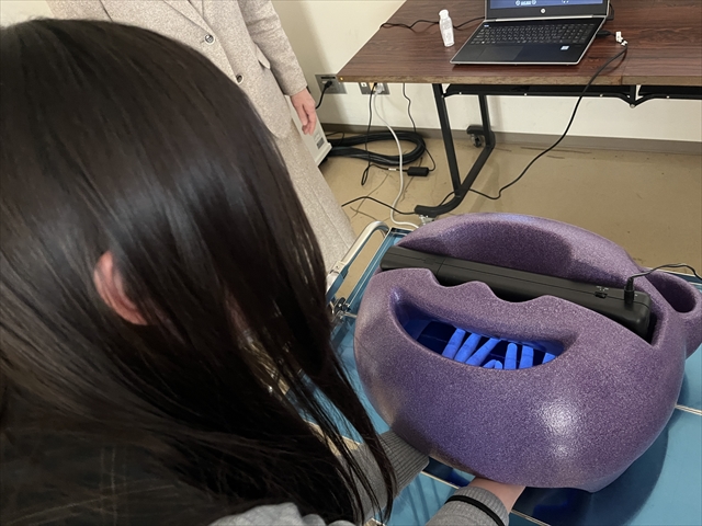 実技形式の体験授業では、ブラックライトに反応するクリームを使って手洗いの重要性を学ぶとともに、清潔を保つためにどのように手洗いを行えば良いのかを実践的に学びました。