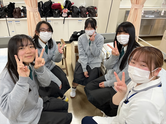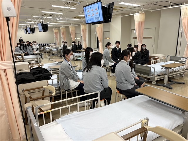 その後は座談会に参加し、現役の看護学生の方々から、学習方法や高校生のうちに取り組むべきことについてなど様々なお話を直接伺うことができました。この交流を通じて、大学での学びや看護を目指す現在の心構えが一層深まりました。また、実技試験や練習が行われる演習室にも案内していただき、大学の学びとその設備についても詳しく知ることができました。