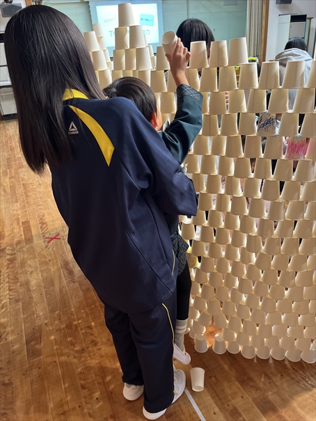 はじめに、常磐大学こども園の子どもたちと一緒に、紙コップと紙飛行機を使ってあそぶ保育体験を行いました。具体的なあそび方は示さずとも、本校の生徒とこどもたちとで様々な遊びの方法を考え、楽しく活動しました。