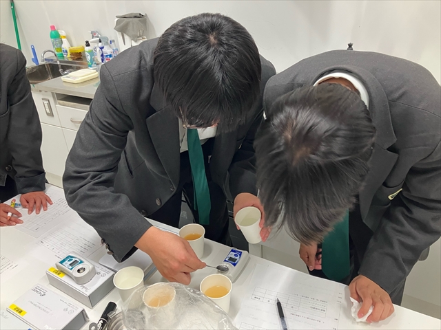 次に、塩味と甘味の測定と官能検査を行いました。食塩、味噌、顆粒だし、砂糖で、6種類の水溶液を作り、測定器で塩分や糖分の濃度を測定したあとに、同じ濃度の水溶液が温度の違いによって味覚にどのような変化を起こすかを検査しました。