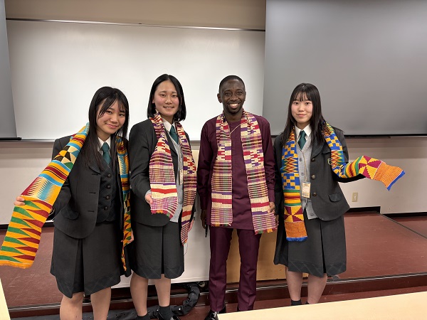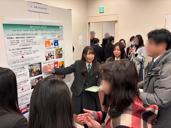 2024年に本校のカンボジア研修旅行に参加した生徒は、研修旅行後も、校内や地域のイベントに積極的に参加し、カンボジアと日本をつなぐ架け橋となるべく活動を続けてきました。今回の大会では、この活動に2025年の参加者も加わり、持続可能なウェルビーイングな社会の実現に向けて、今の自分たちにできることについて発表しました。
