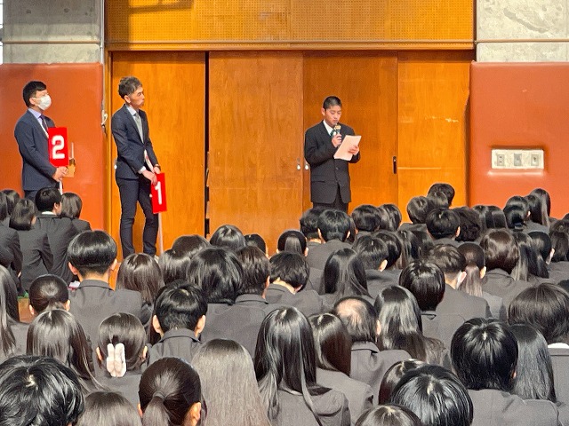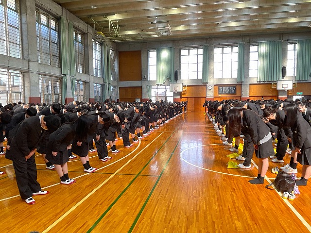 今日は新入生の初登校日。全校生徒がつどい、新入生歓迎セレモニーを行いました。